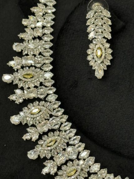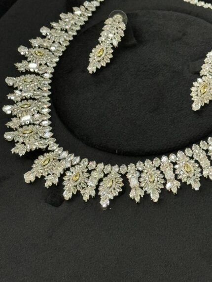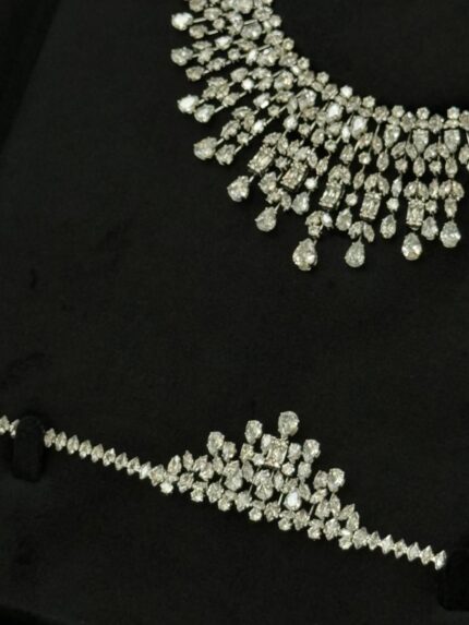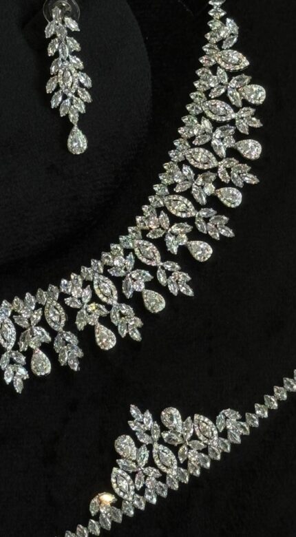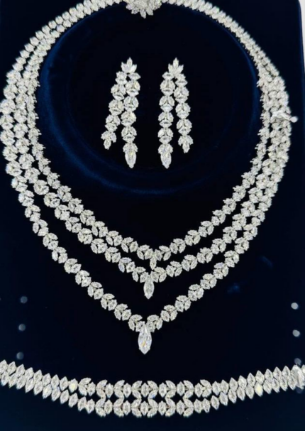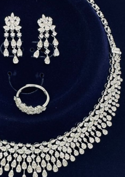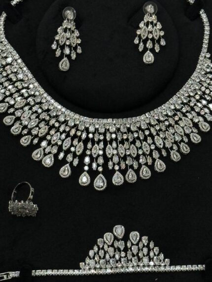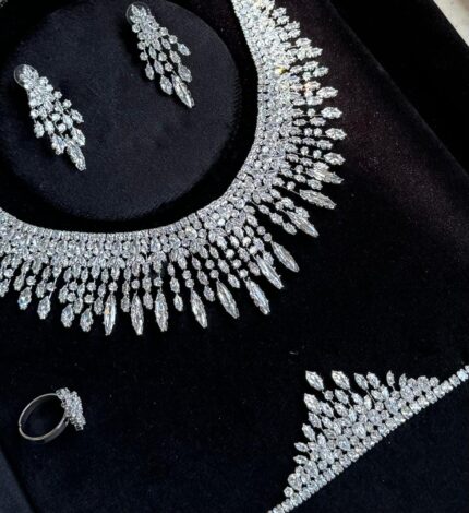 عقد كامل قلادة و حلق و اسواره وخاتم. 116 زركون لون فضي 4 قطع مع علبة فخمة ( عفراء السويدي ) مقاس كبير