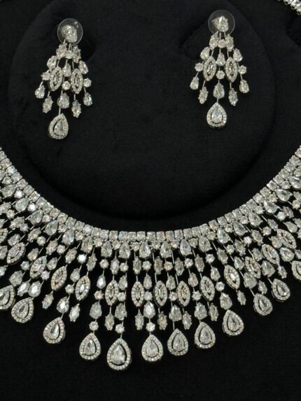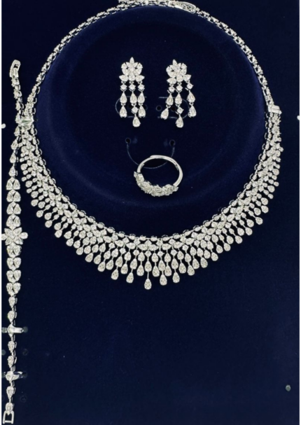 عقد كامل قلادة و حلق و اسواره وخاتم. 117 زركون لون فضي 4 قطع مع علبة فخمة ( عقد نهياني ) مقاس وسط
